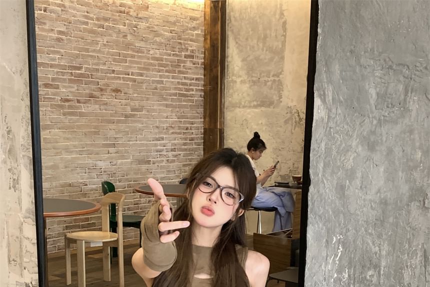 Sleeveless Round Neck Cutout Top / Mid Waist Faux Leather Mini Pencil Skirt