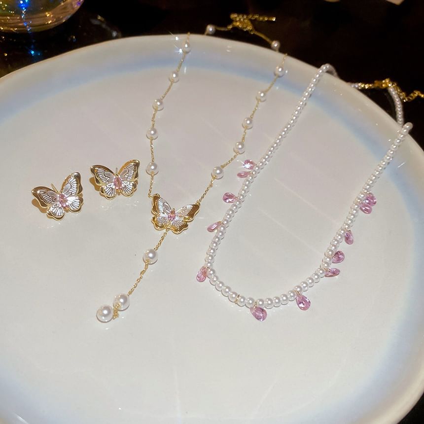 Necklace Layered / Stud Earring Faux Pearl Butterfly