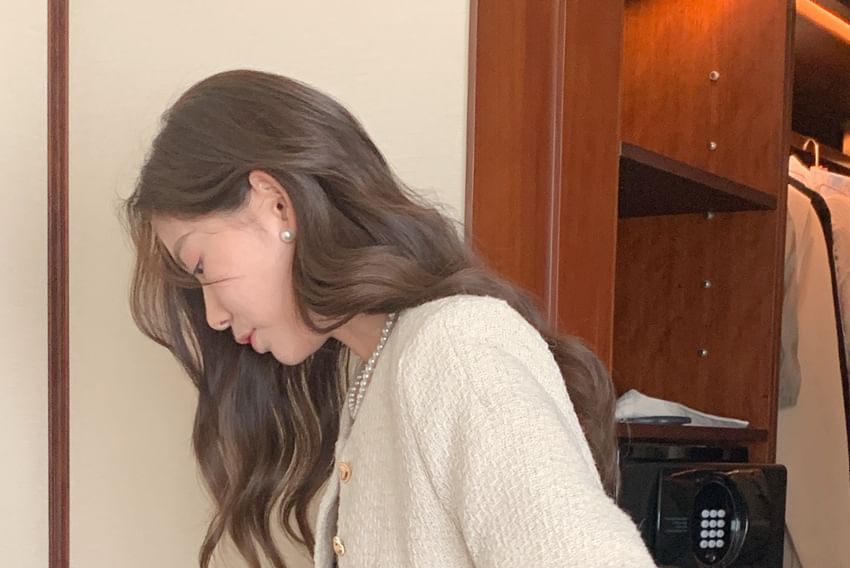 Elbow-Sleeve Crew Neck Button-Up Plain Tweed Crop Jacket