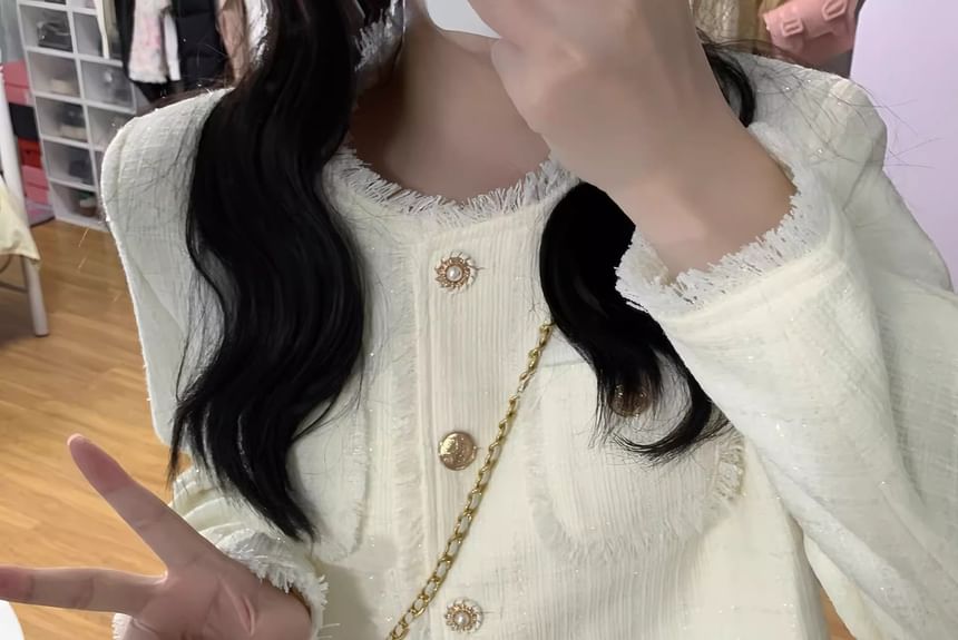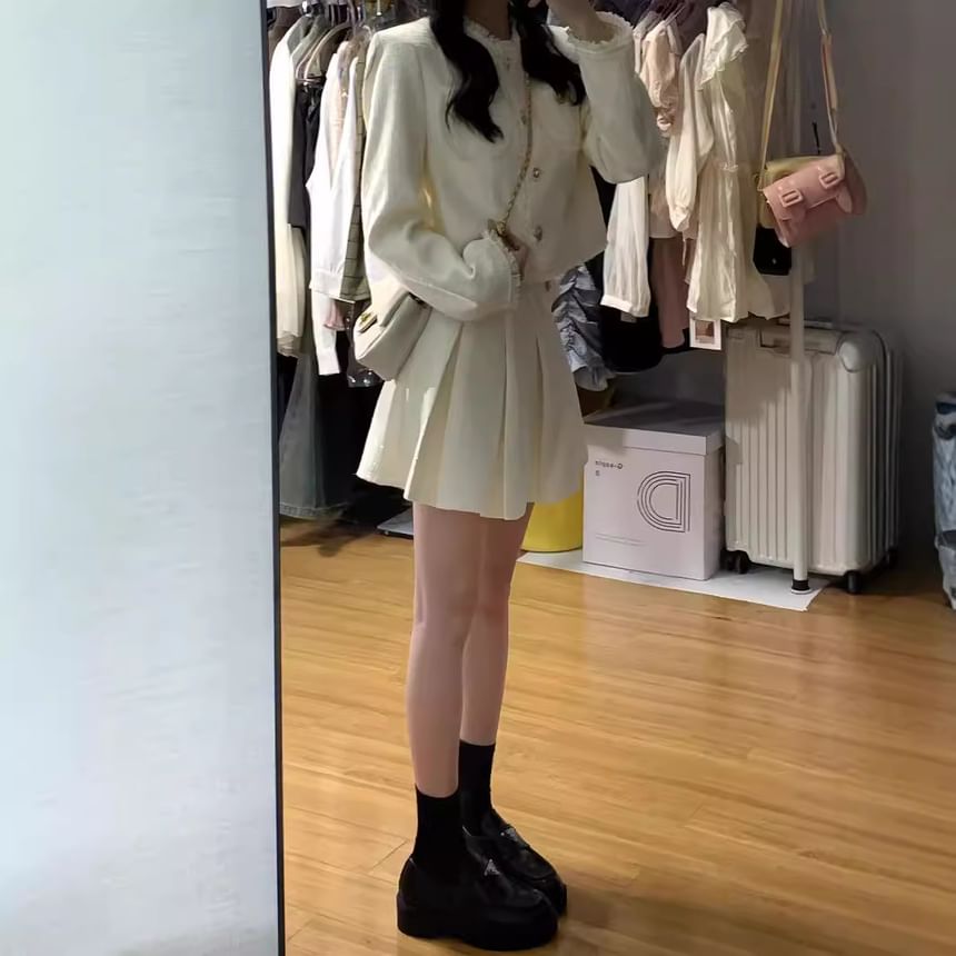 Set: Fringed Tweed Cropped Button Jacket + High Waist Pleated Mini A-Line Skirt