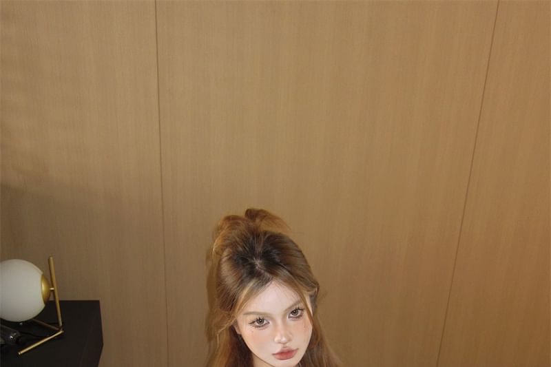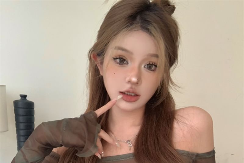 Off-Shoulder Long-Sleeve Set: + Camo Tube Top Print Mesh Crop
