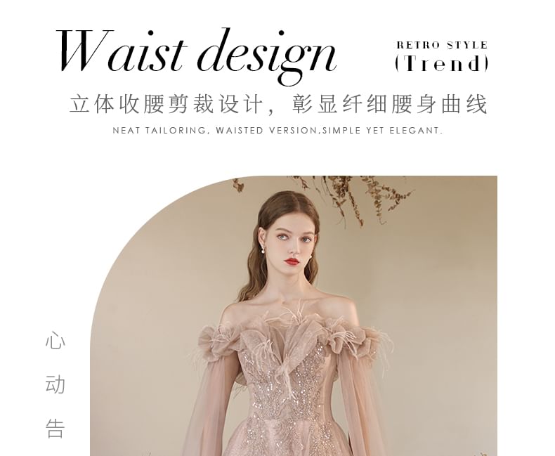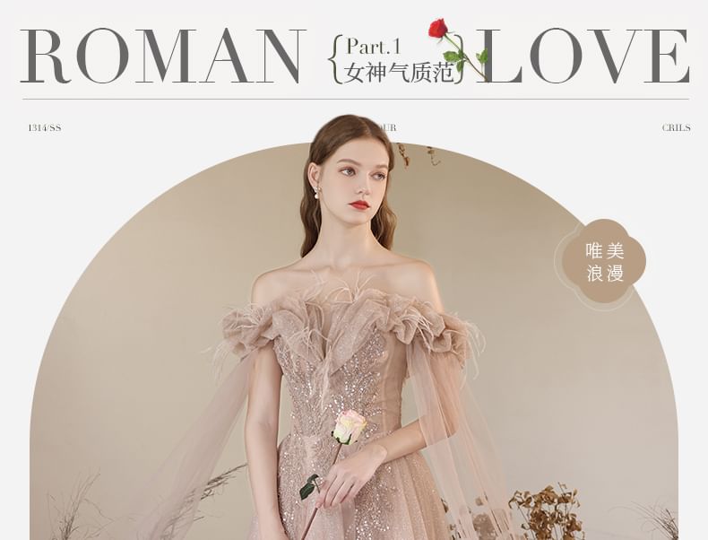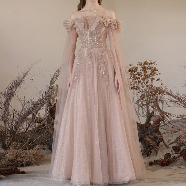 Off-Shoulder Mesh Panel Feather Accent Ruffle Trim Sequin A-Line Evening Gown