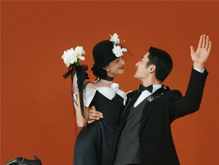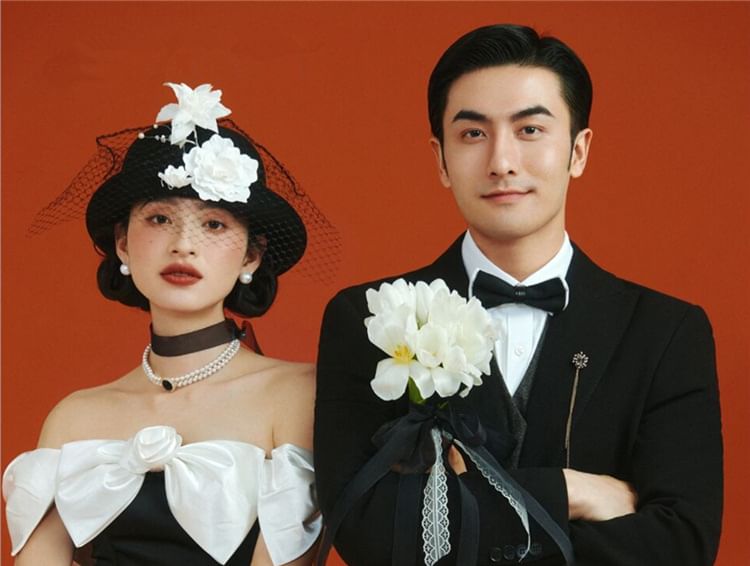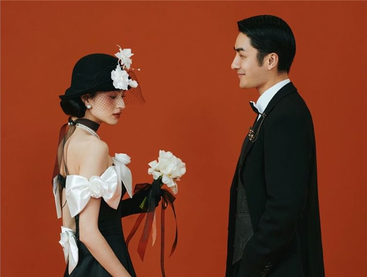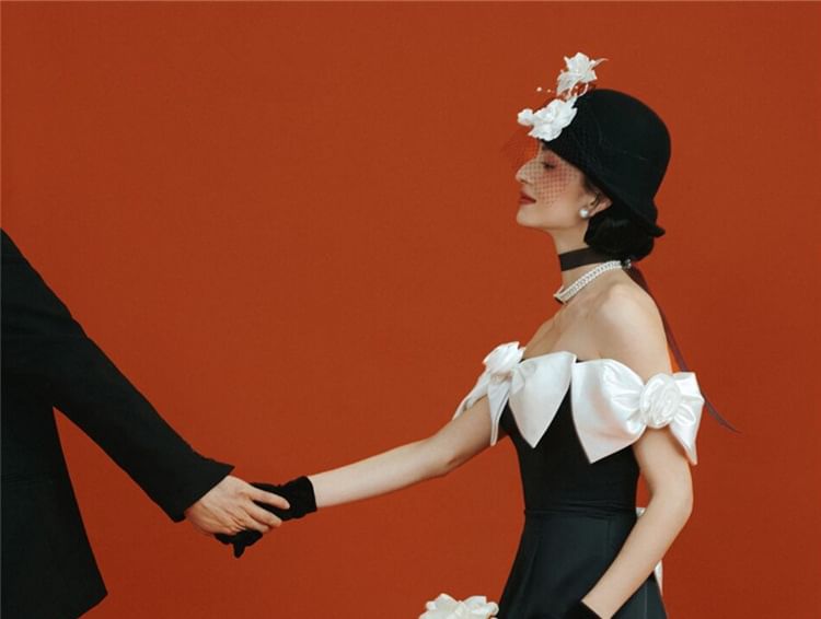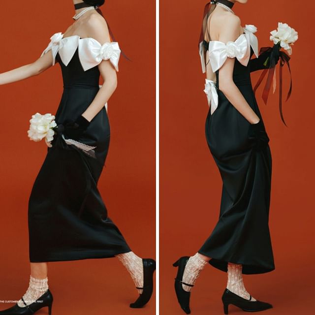 Off Shoulder Two Tone Bow Sheath Wedding Gown