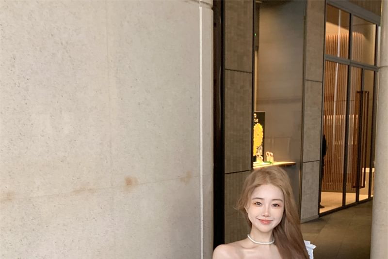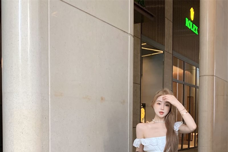 Off-Shoulder Ruffled Midi A-Line Eyelet Lace Dress