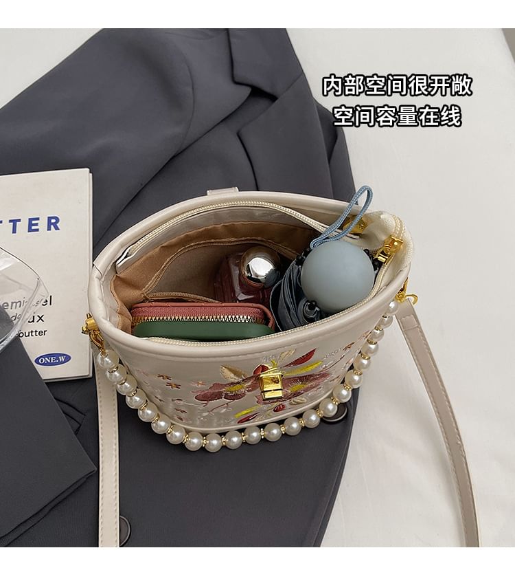 Pearl Faux Bucket Strap Embroidered Bag Floral