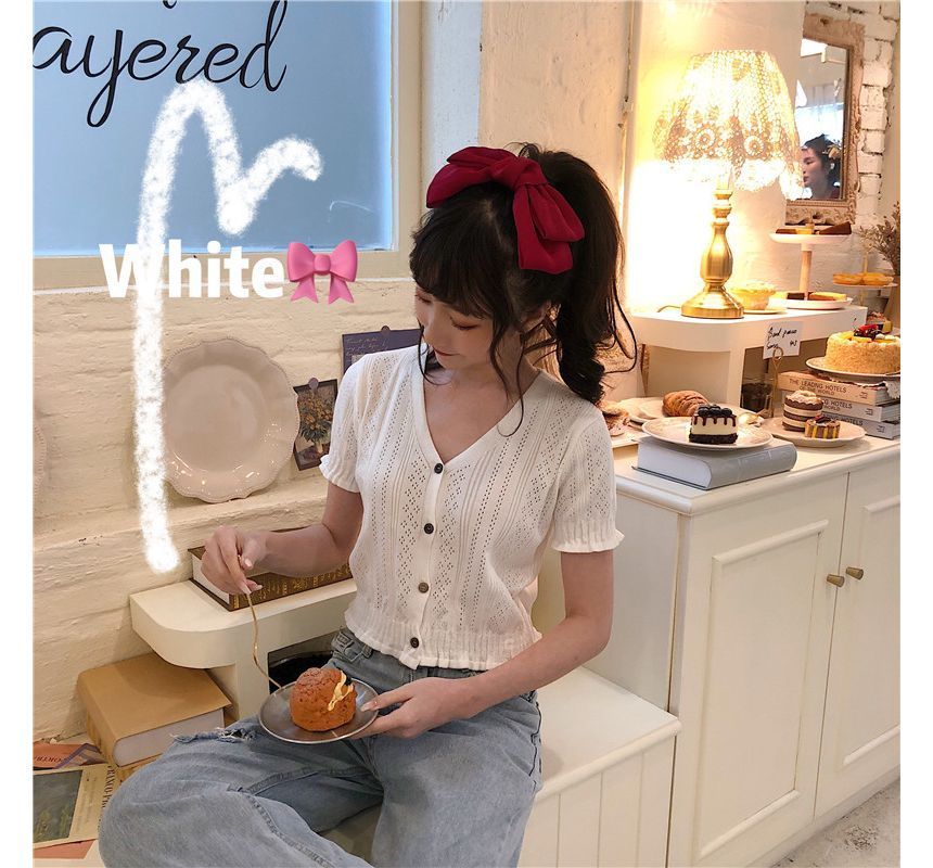 Perforated Knit Top Button-Up V-Neck Short-Sleeve