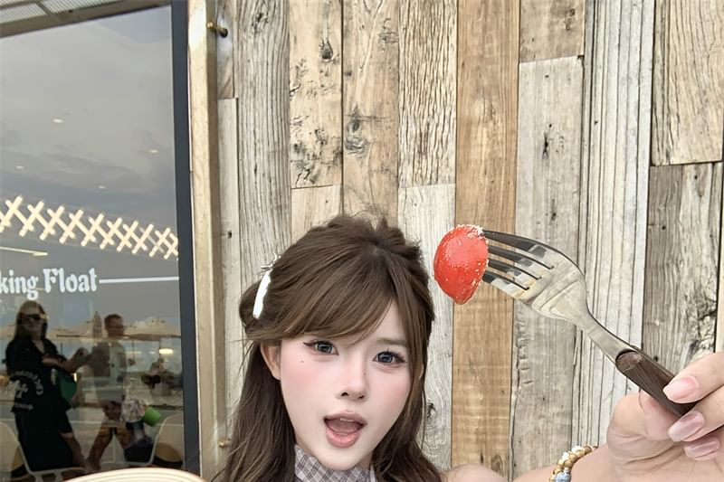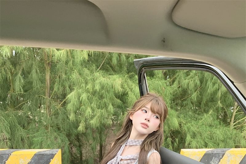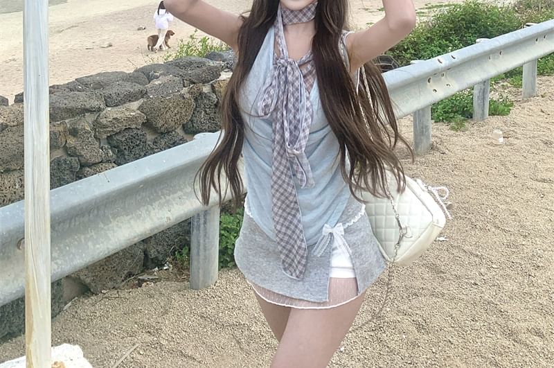 Sleeveless Cowl Neck Plaid Mock Two Piece Top
