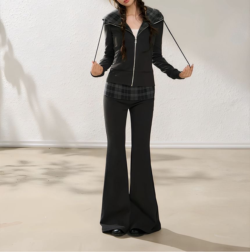Plaid Panel Zip-Up Slim Fit Hoodie / High Waist Flared Pants