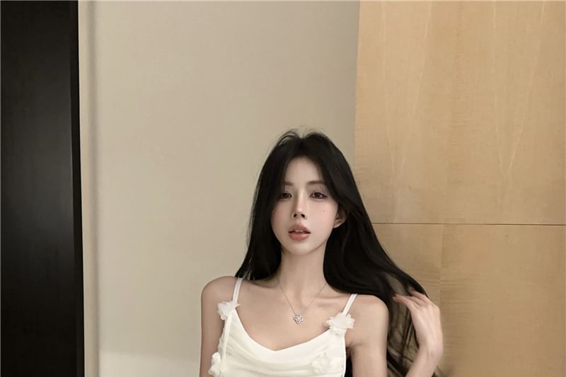 Spaghetti Strap Plain Flower Detail Ruched Side-Slit Maxi Mermaid Dress