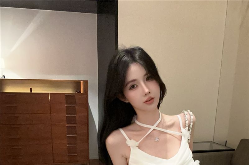 Plain Dress Detail Spaghetti Mermaid Side-Slit Flower Strap Ruched Maxi