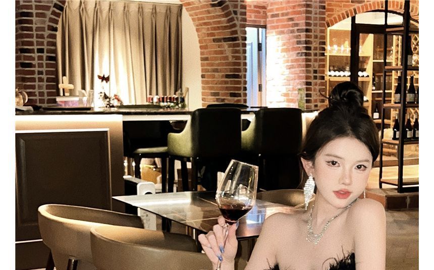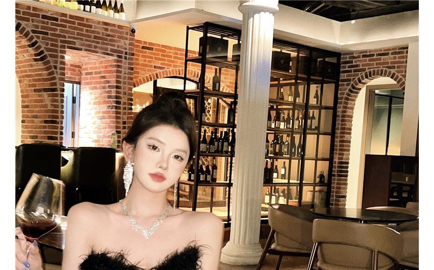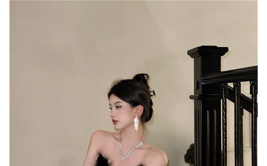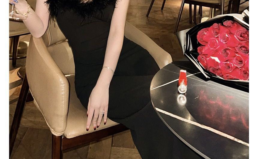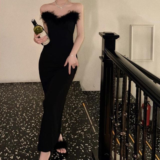 Plain Feather Trim Maxi Sheath Tube Dress