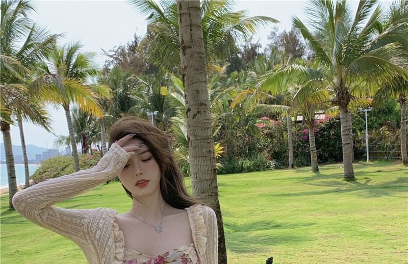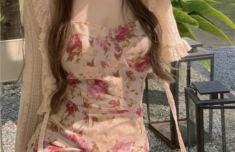 Plain Frill Trim Tie Front Lace Crop Light Jacket / Spaghetti Strap Floral Print Slit Midi Bodycon Dress
