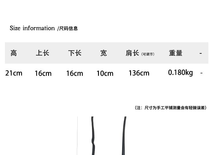 | Height | Upper Length | Bottom Length | Width | Strap Length |