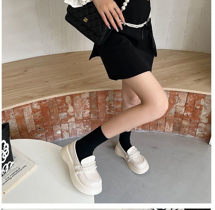 Platform Faux Pearl Accent Frill Trim Patent Leather Loafers
