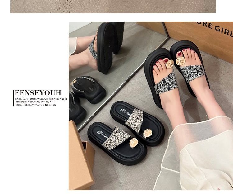 Platform Floral Print Metal Accent Toe Loop Slide Sandals