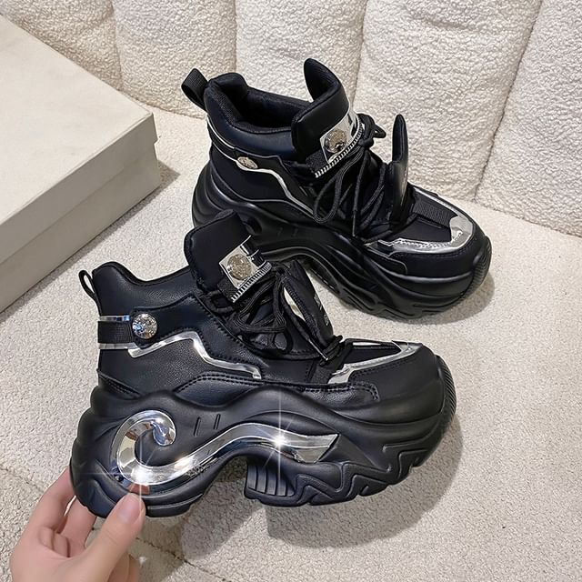 Platform Metallic Leather Top Lace-Up High Sneakers Faux Panel