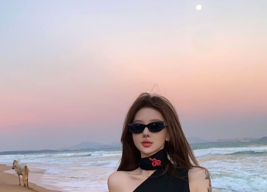 Print One-Shoulder Halter Fit Slim Tank Top Snake