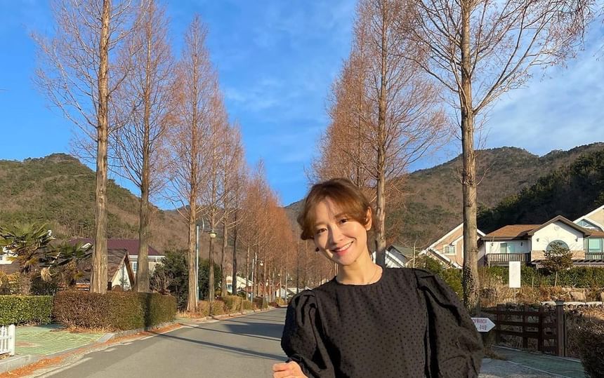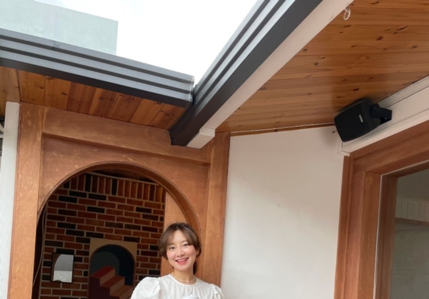Puff-Sleeve Crewneck Dotted Maxi A-Line Dress