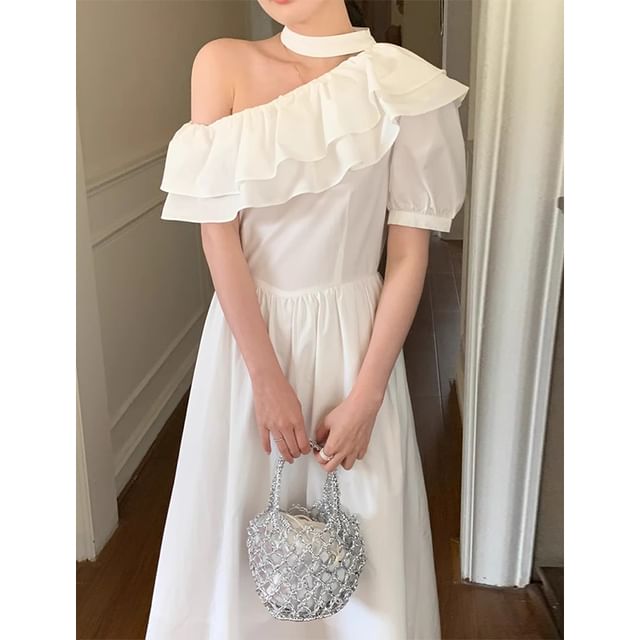 Puff-Sleeve One-Shoulder Plain Ruffle Maxi A-Line Dress