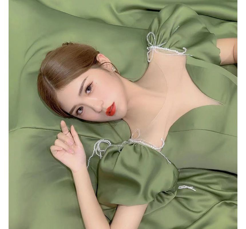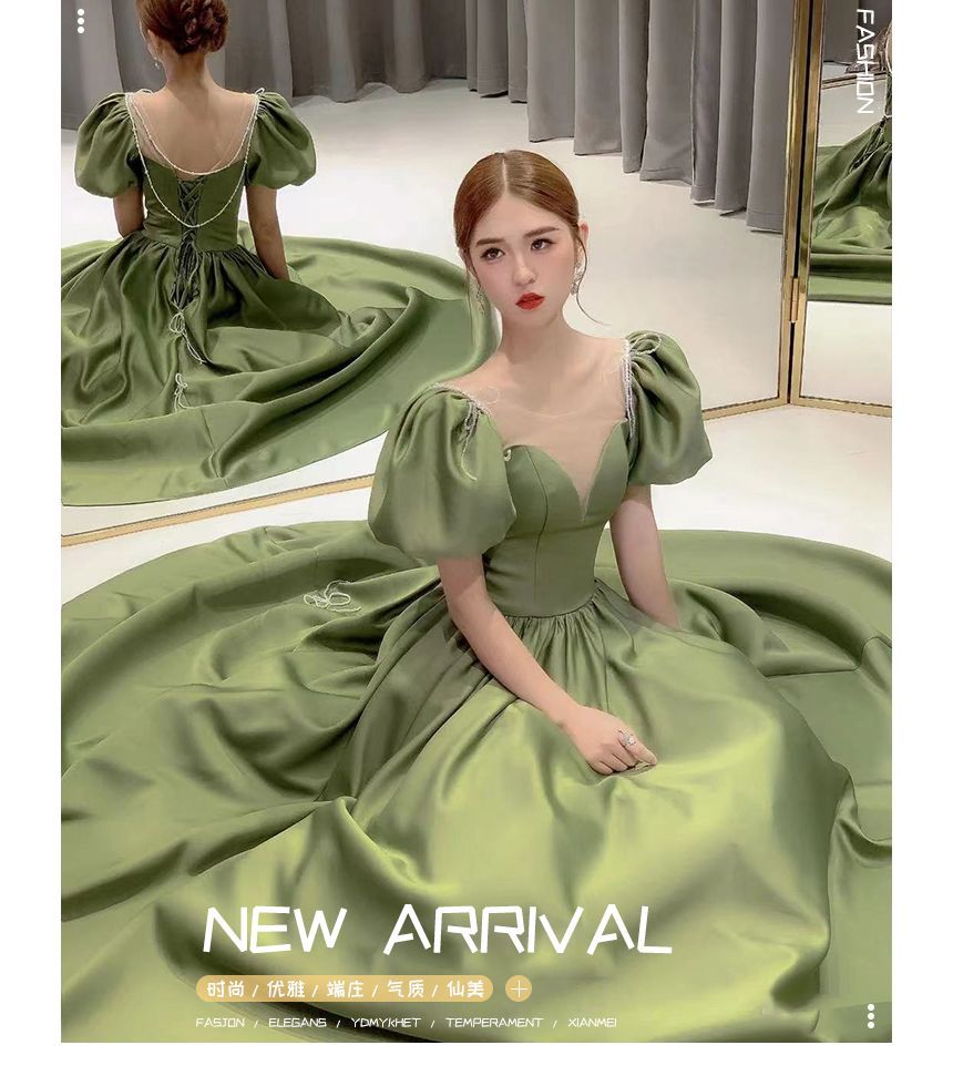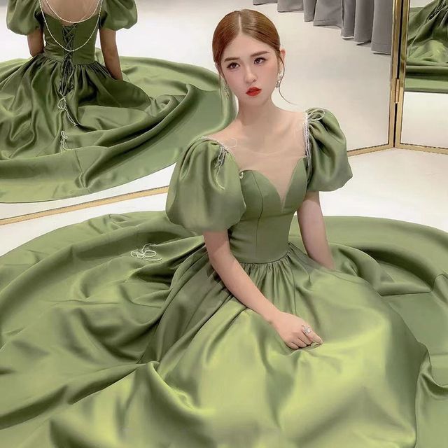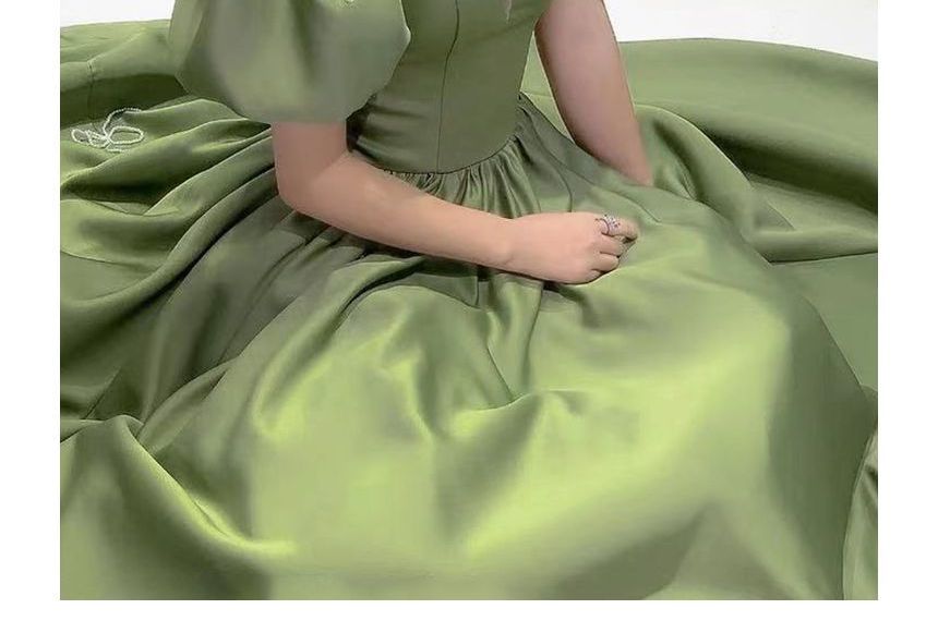 Puff Sleeve Scoop Neck Faux Pearl Beaded Mesh Panel Satin A-Line Evening Gown