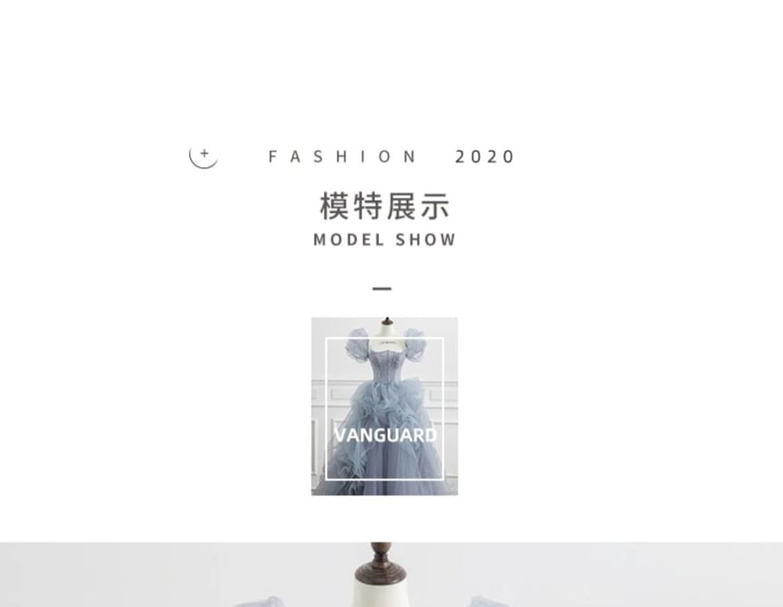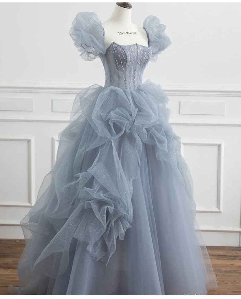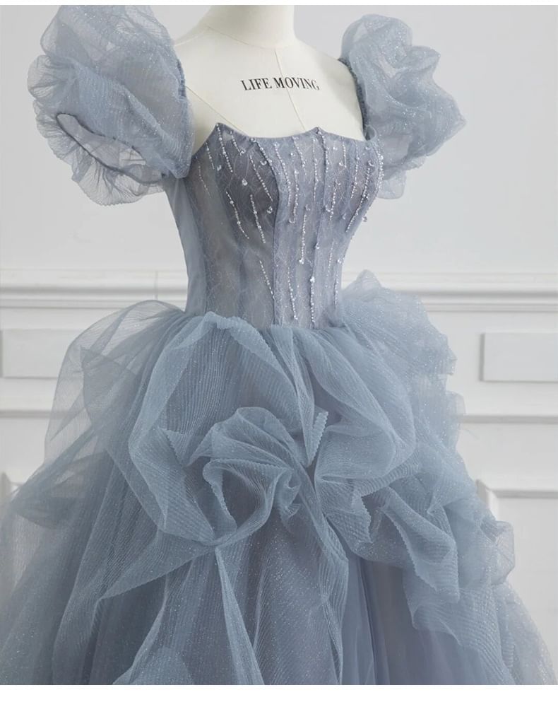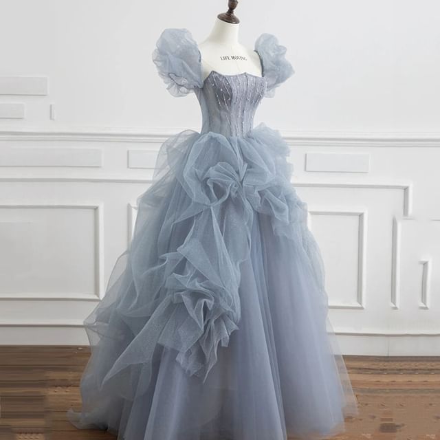 Puff Sleeve Square Neck Plain Beaded Ruched Panel Mesh A-Line Evening Gown