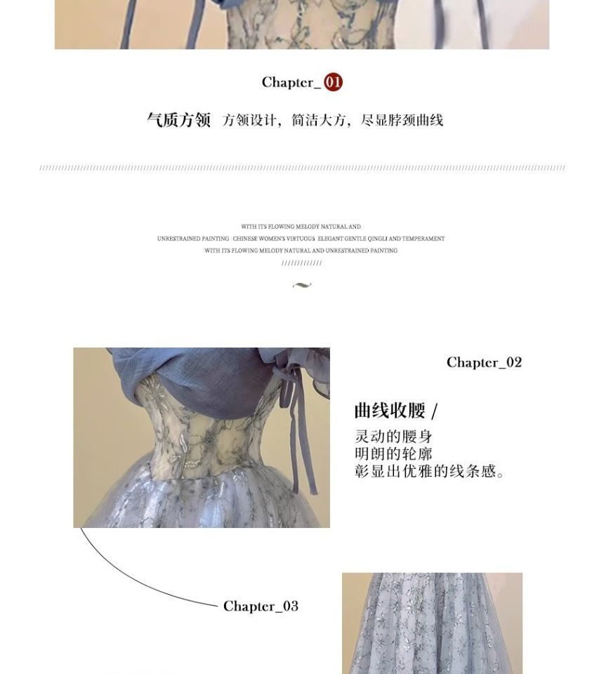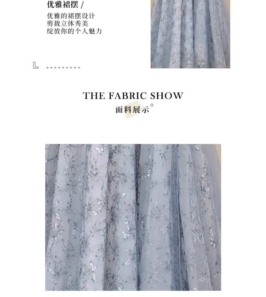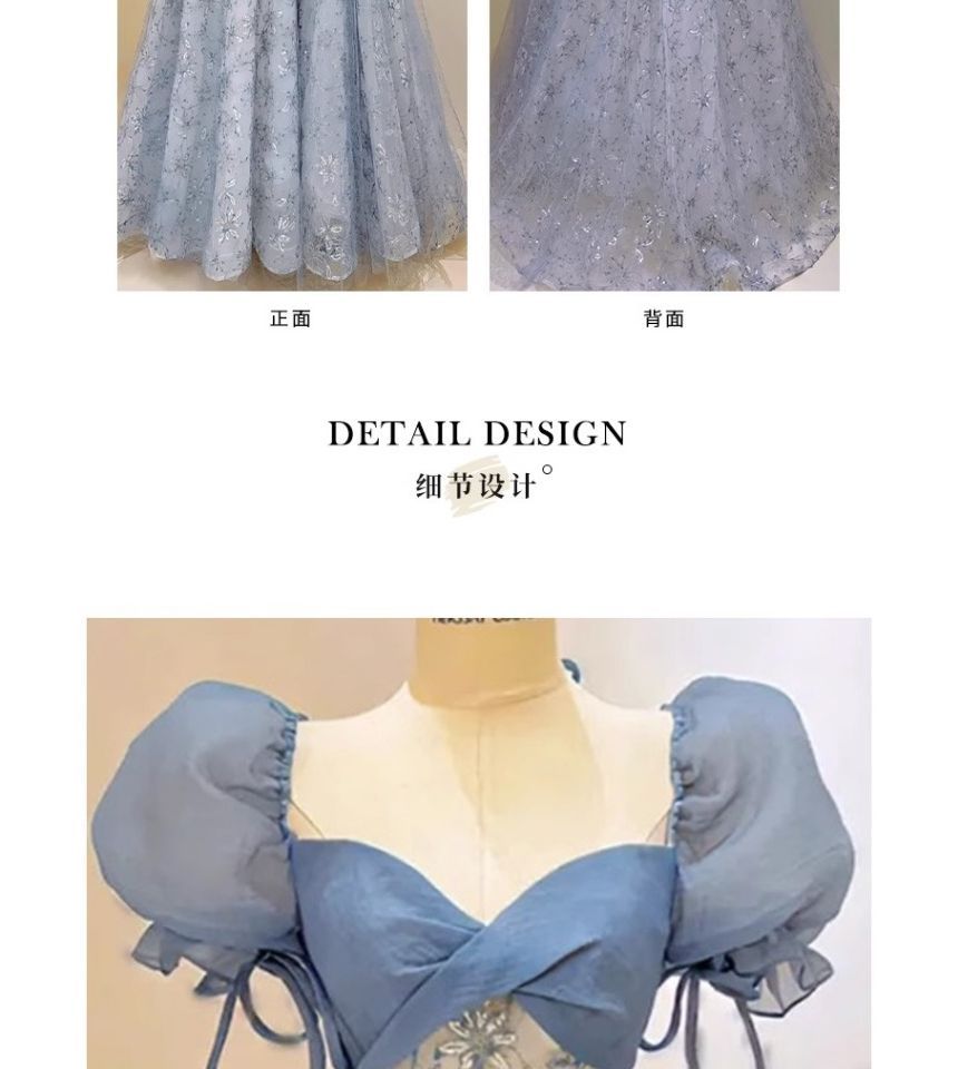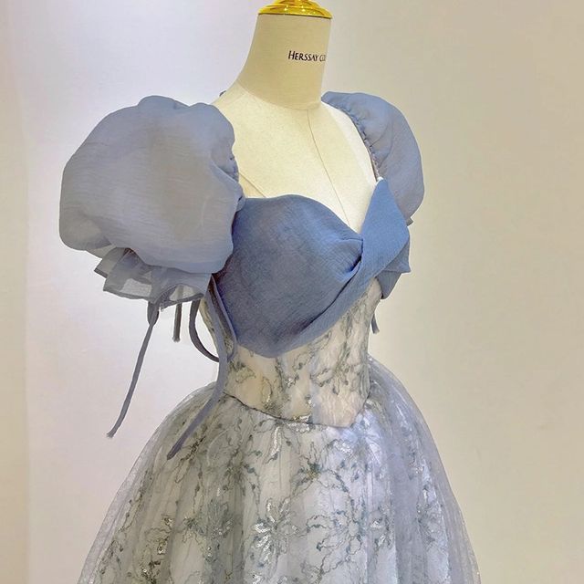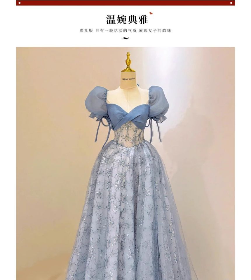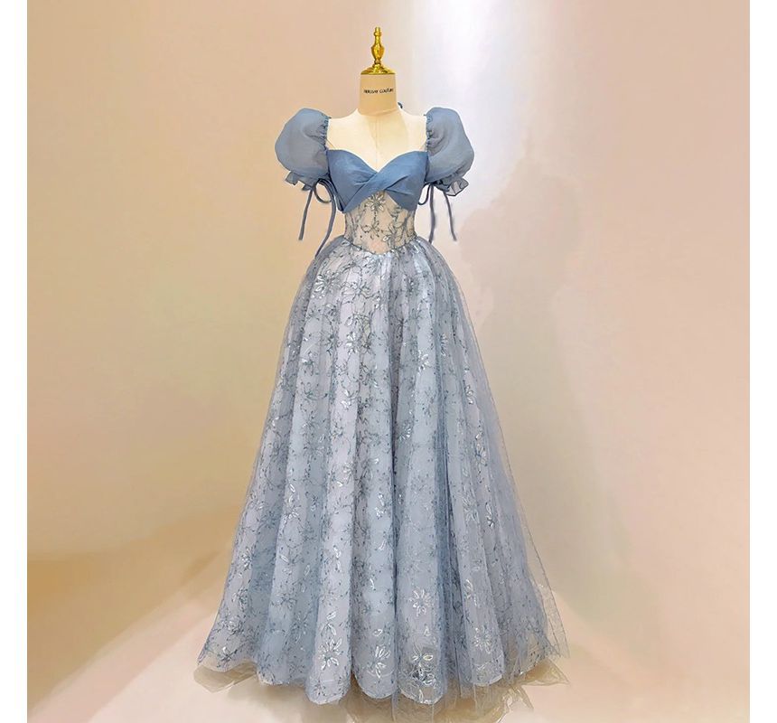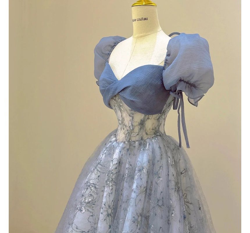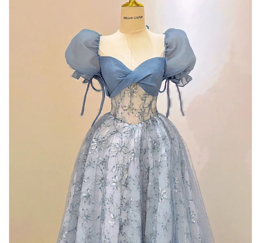 Puff Sleeve Sweetheart Neck Floral Patterned Sequin Mesh A-Line Evening Gown