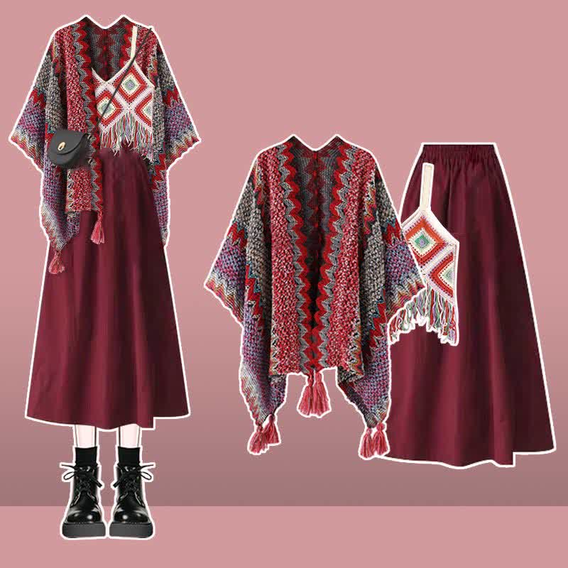 Red Boho Shawl Wrap Fringed Cami Top High Waist Skirt