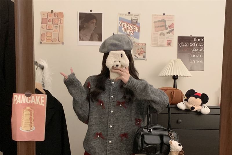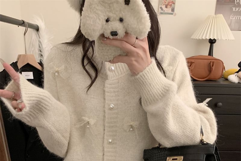 Round Neck Bow Faux Pearl Button Cardigan / High Rise Tweed Mini A-Line Skirt