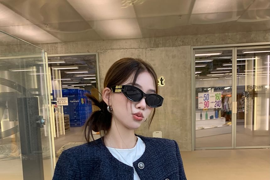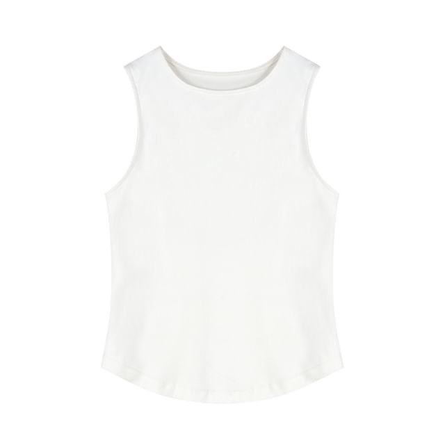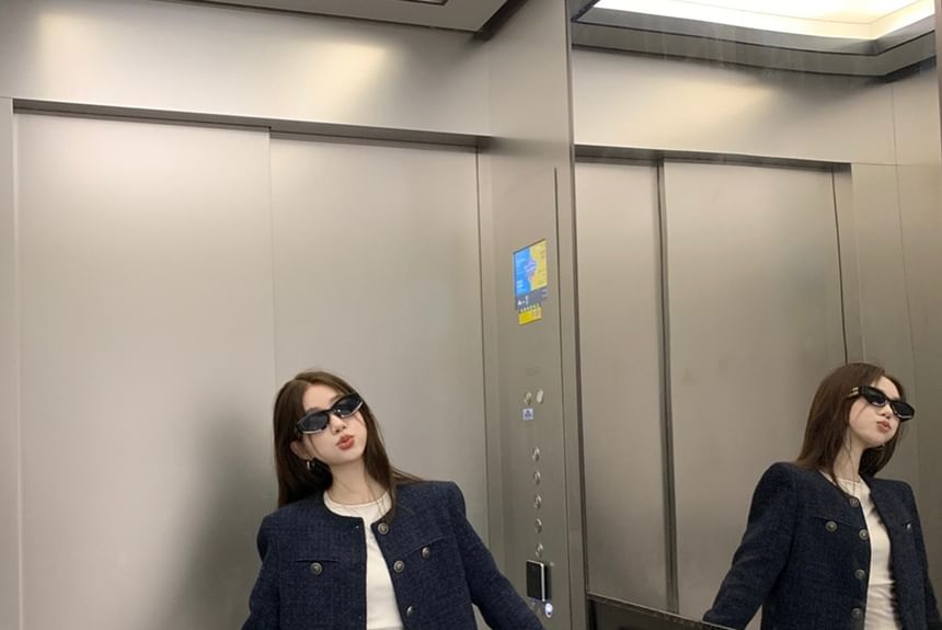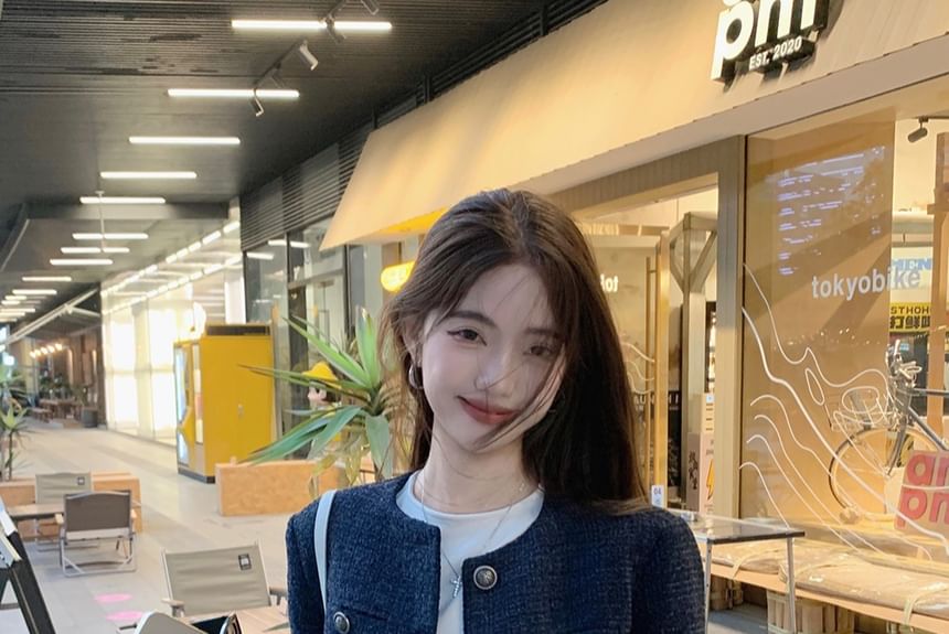 Round Neck Button-Up Tweed Crop Jacket / Plain Tank Top / Mid Rise Washed Wide Leg Jeans