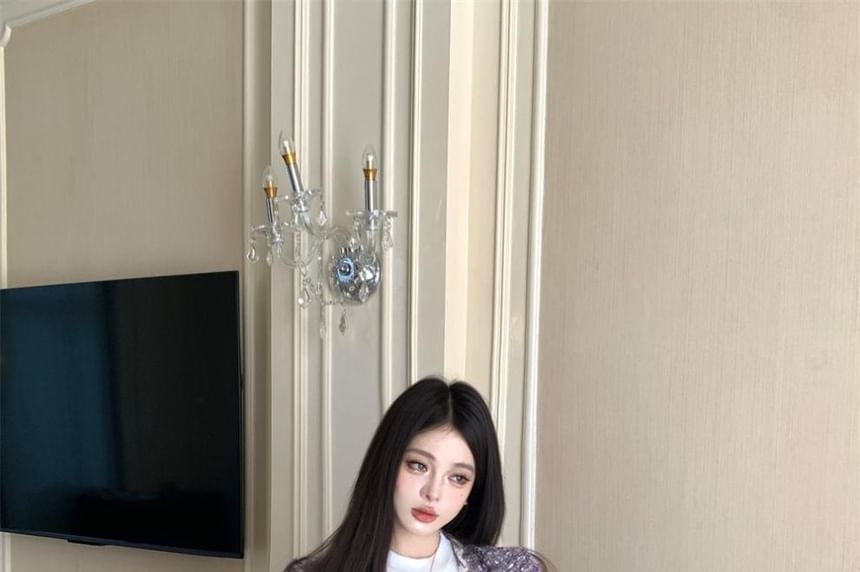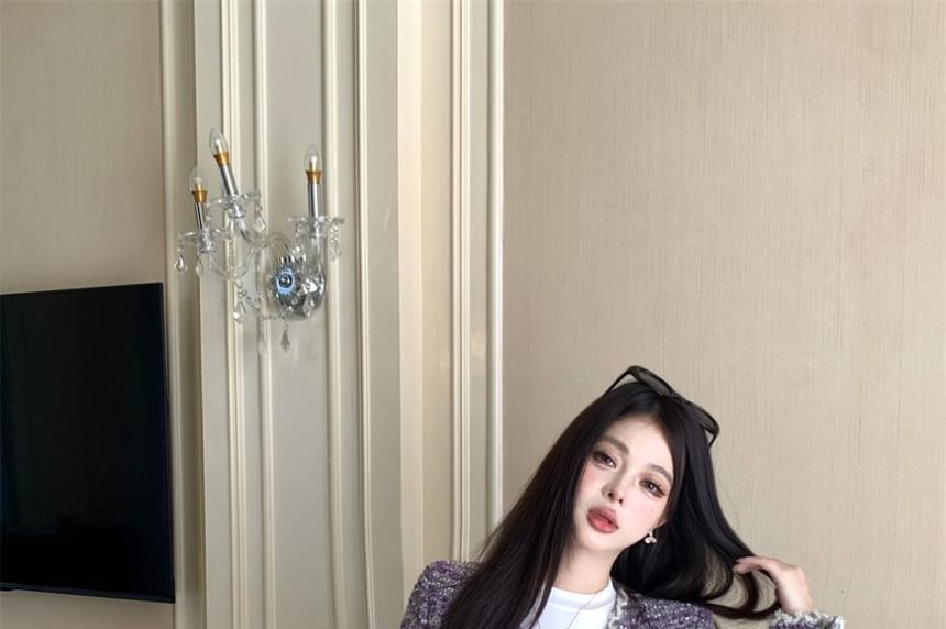 Round Neck Melange Glitter Tweed Button Jacket