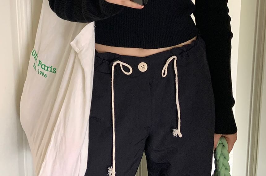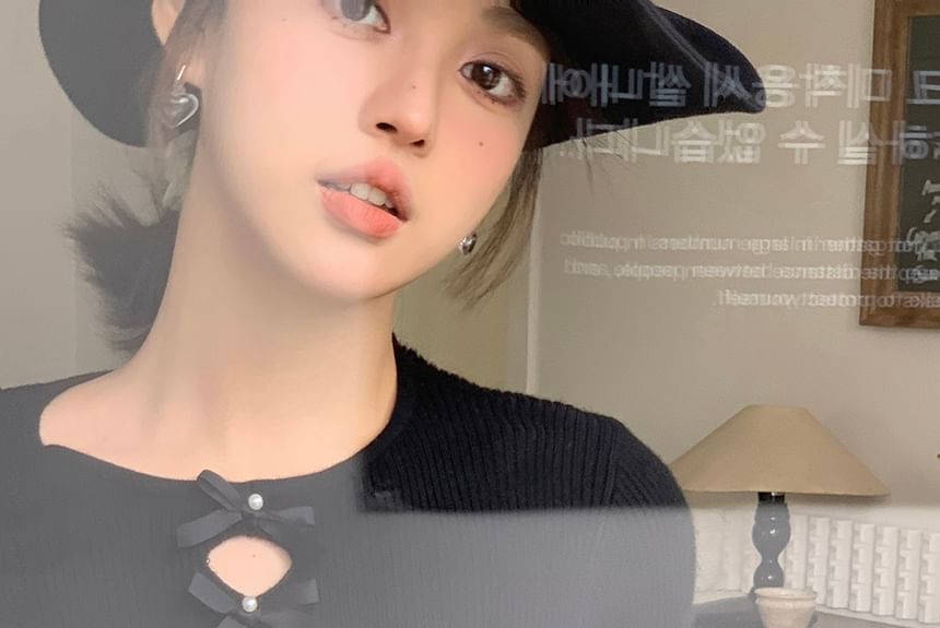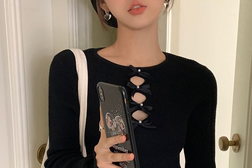 Round Neck Plain Bow Cutout Ribbed Cropped Sweater