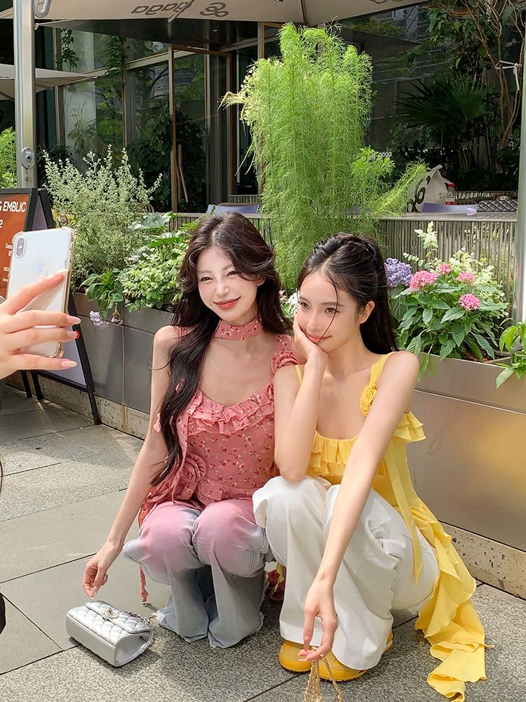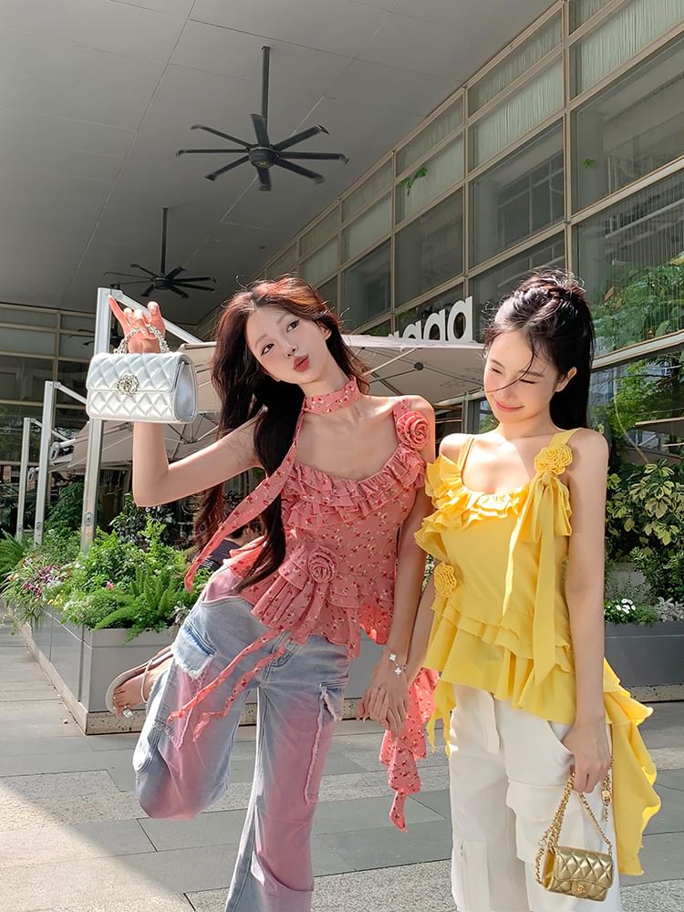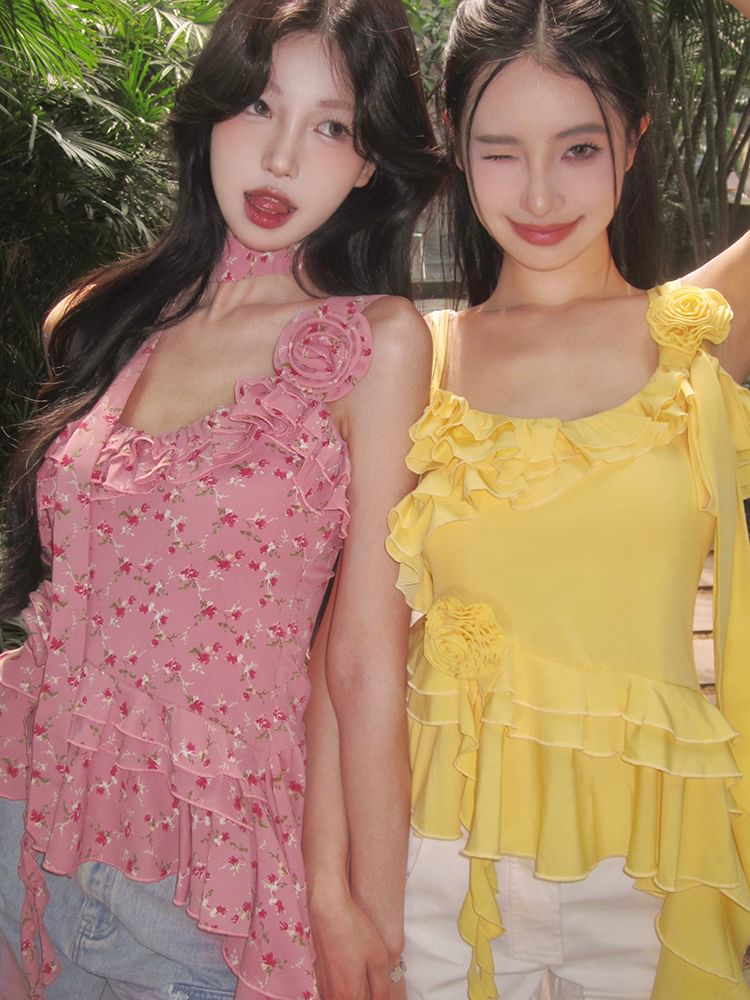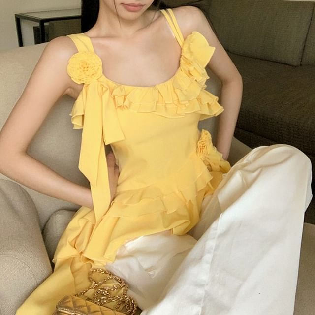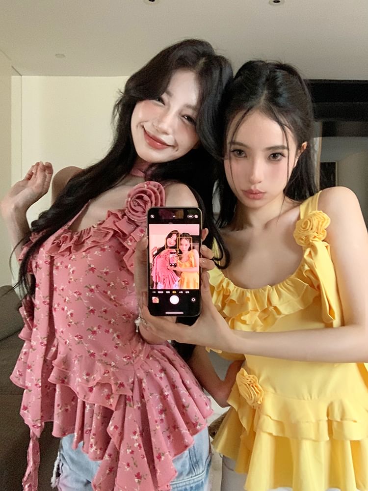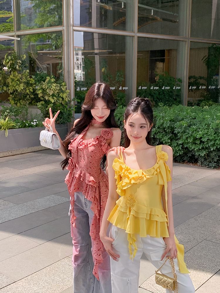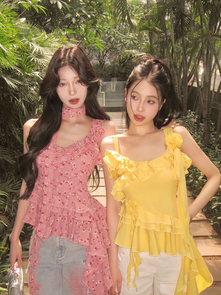 Plain Floral Detail Ruffle Asymmetrical Cami Top