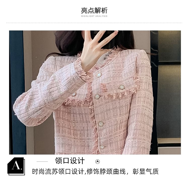 Set: Band Collared Tweed Button Jacket + High Waist Plain Mini Pencil Skirt