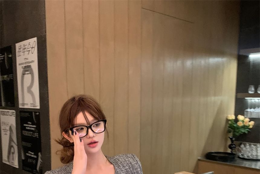 Set: Crew Neck Button-Up Tweed Crop Jacket + High Waist Wide Leg Pants