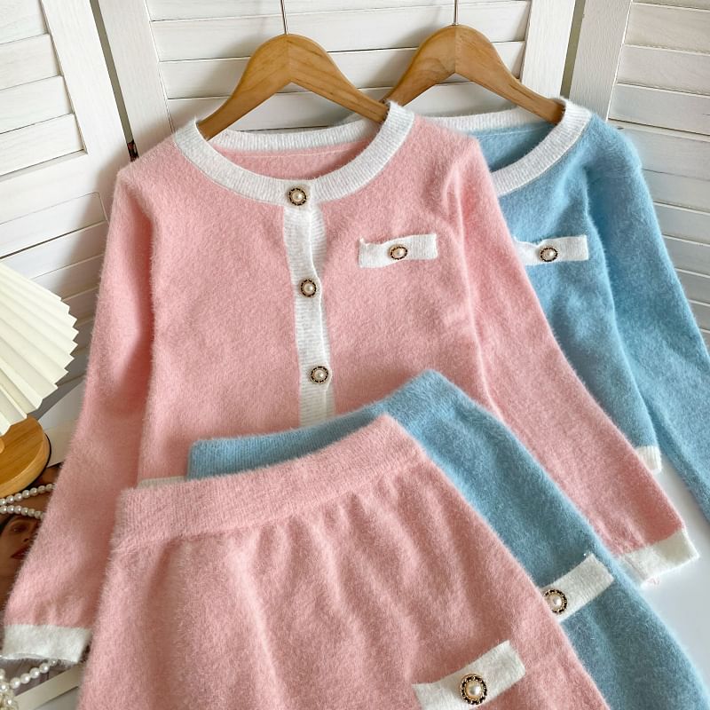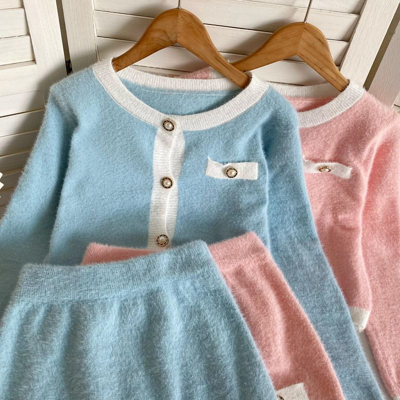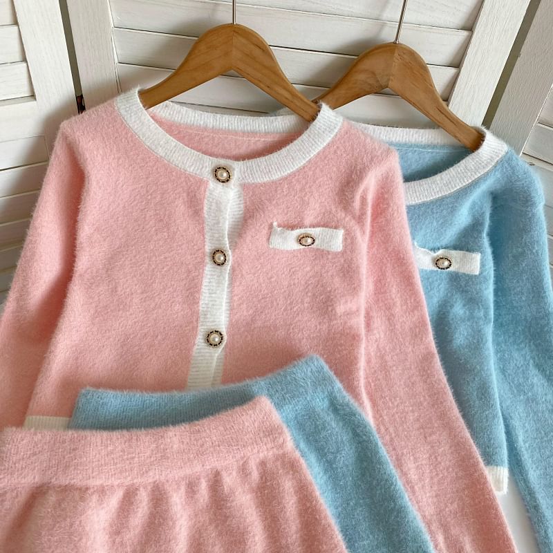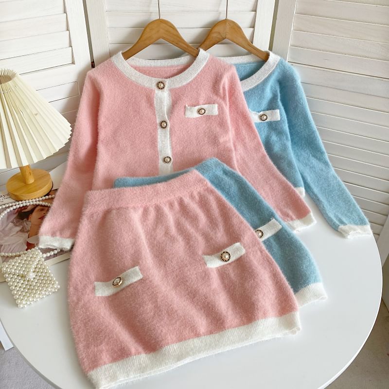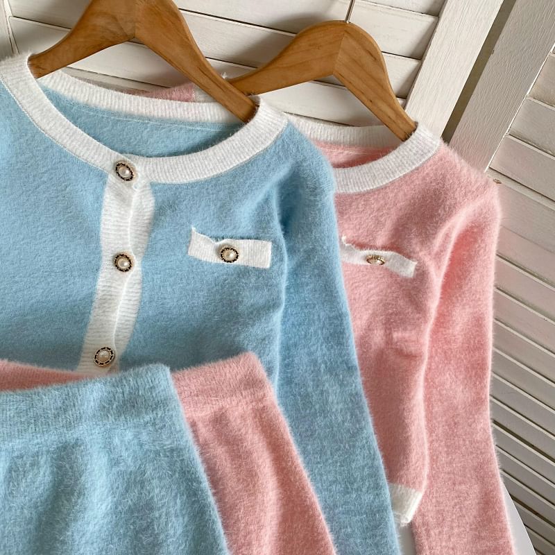 Set: Crew Neck Contrast Trim Button-Up Crop Cardigan + High Waist Mini Pencil Knit Skirt