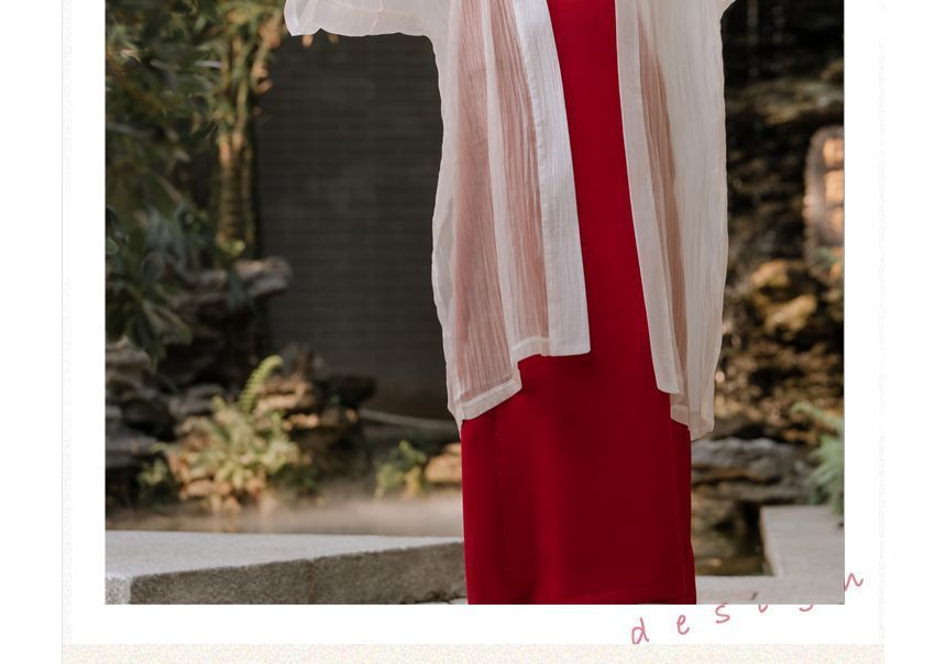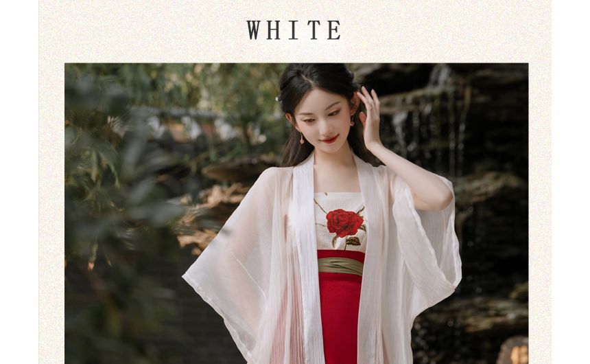 Set: Floral Print Camisole Top + Plain Midi Hanfu Jacket + High Waist Tie