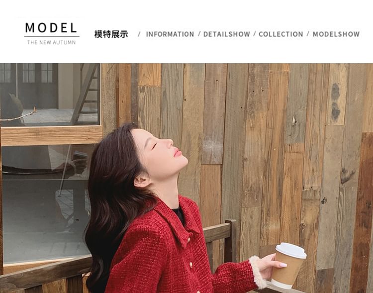 Set: Fluffy Collared Tweed Button Up Jacket + High Rise Midi A-Line Skirt