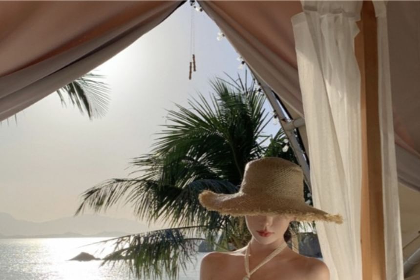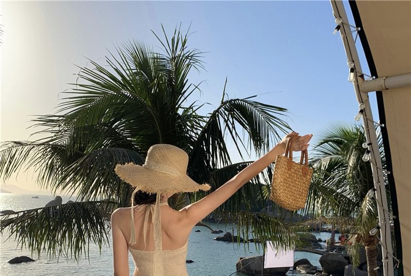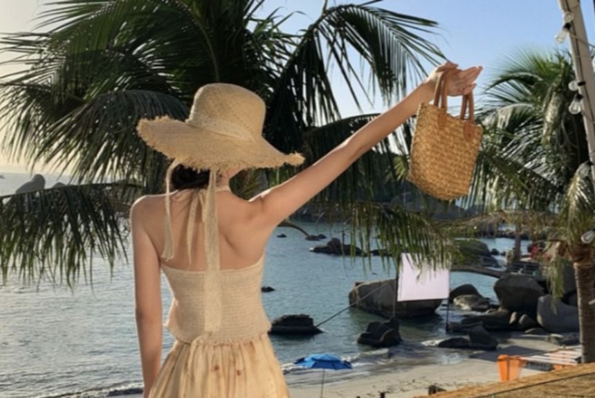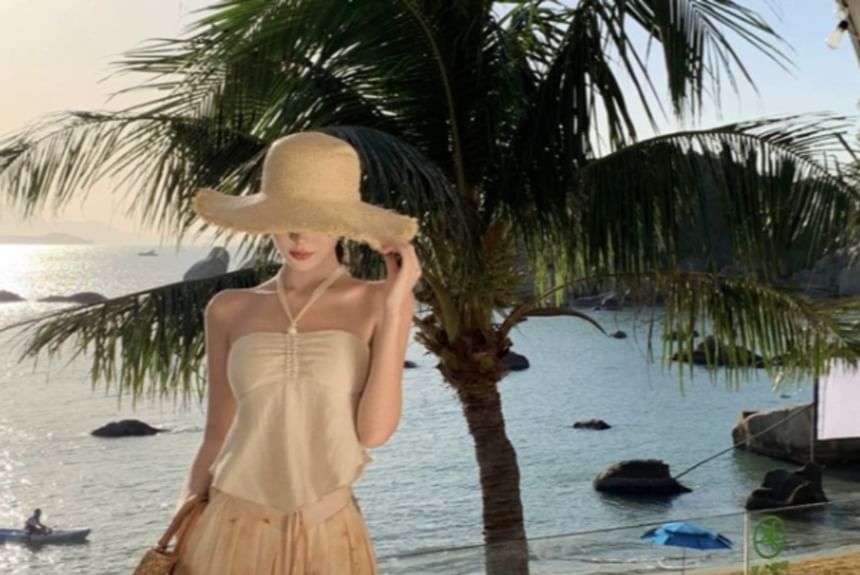 Set: Halter Neck Plain Crop Top + High Waist Floral Print Maxi Skirt