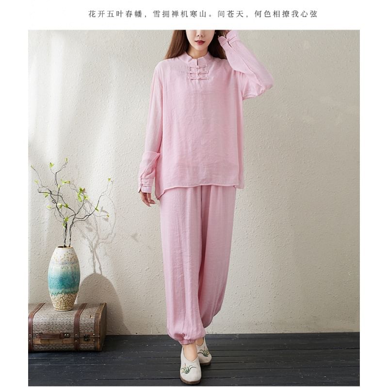 Set: Long-Sleeve Band Collar Plain Hanfu Top + Plain Camisole Top + Mid Rise Plain Harem Pants