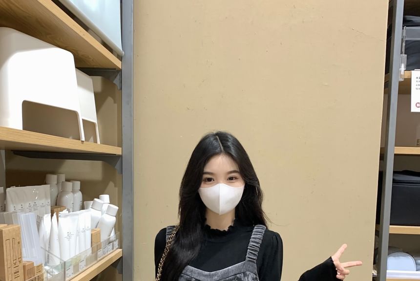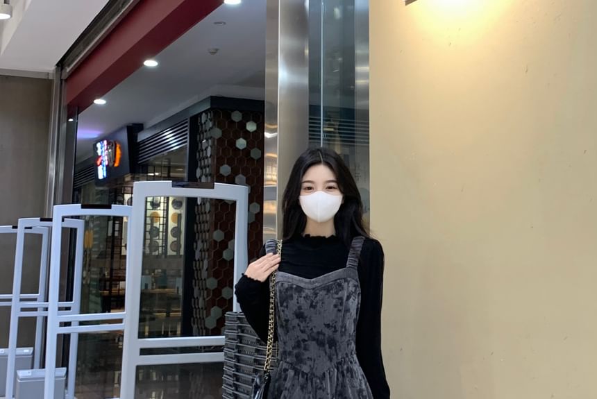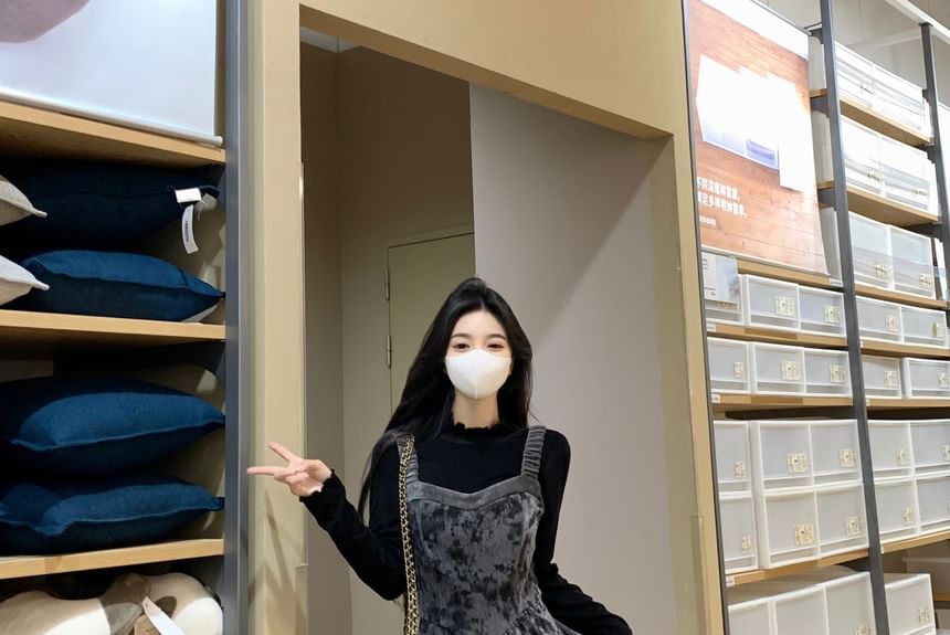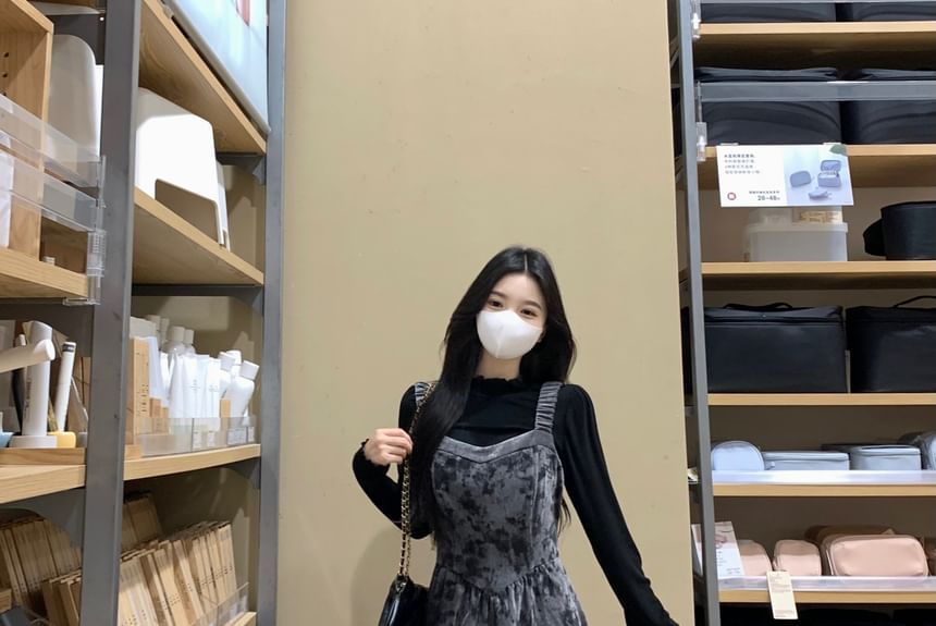 Set: Long-Sleeve Mock Neck Plain Ruffle Trim Tee + Floral Maxi Overall Dress