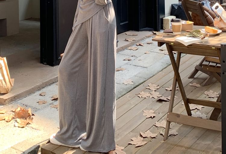 Set: Long-Sleeve Off Shoulder Plain Ruched Slit Tee + Mid Rise Plain Wide Leg Pants