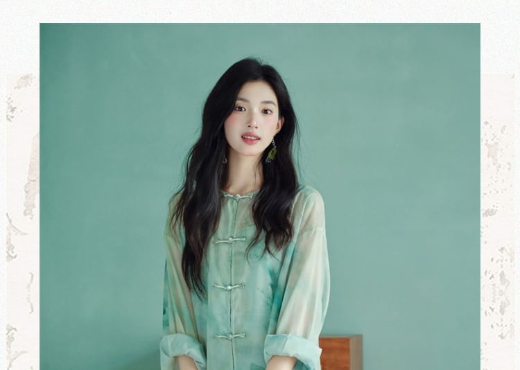 Set: Print Sheer Jacket + Spaghetti Strap Maxi Sheath Dress