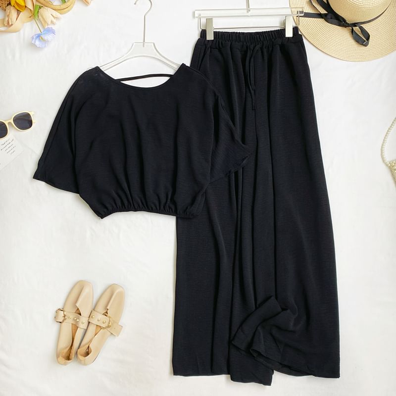 Set: Short-Sleeve Crew Neck Plain Open Back Crop Tee + Elastic Waist Wide Leg Pants