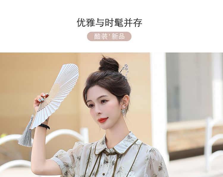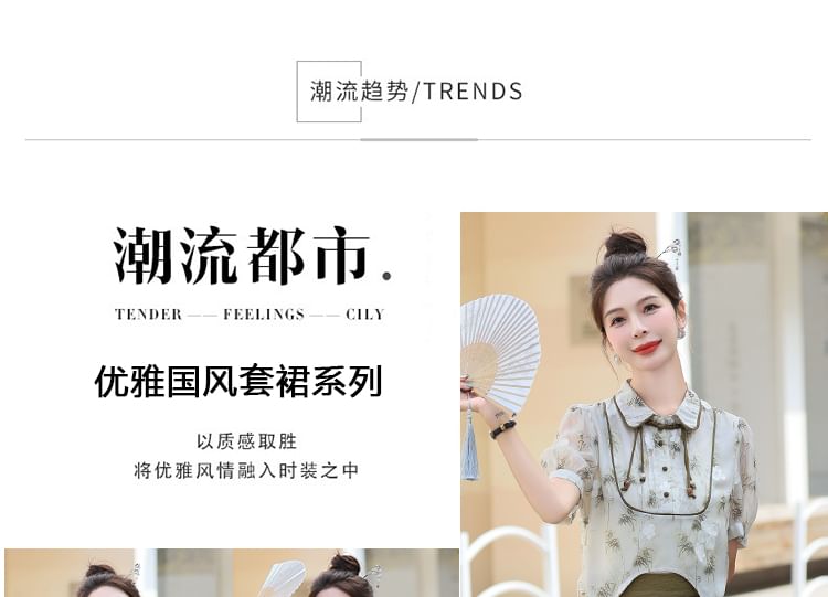 Set: Short-Sleeve Floral Asymmetrical Cropped Frog Button Blouse + Elastic Waist Mini A-Line Skirt