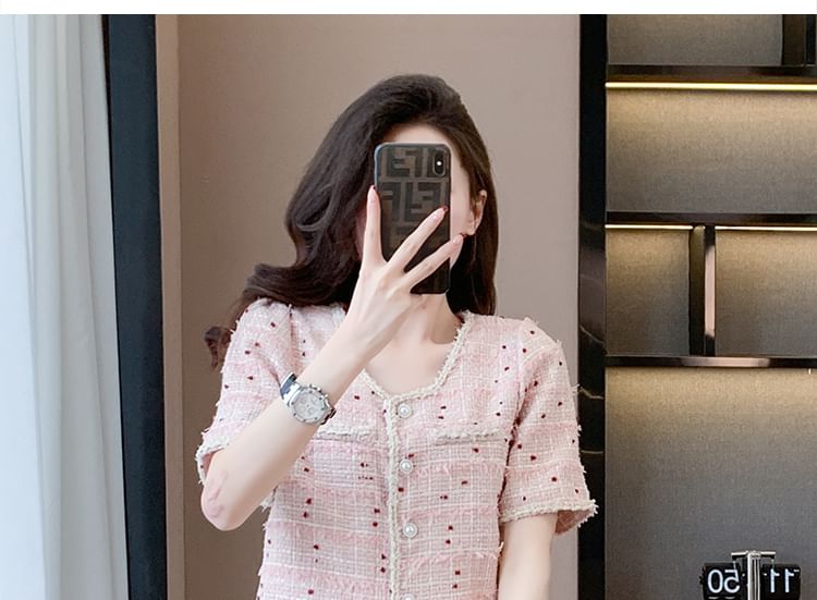 Set: Short-Sleeve Fringed Tweed Button Jacket + High Waist Mini A-Line Skirt
