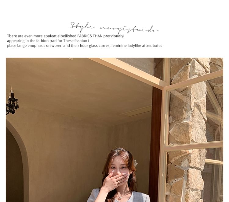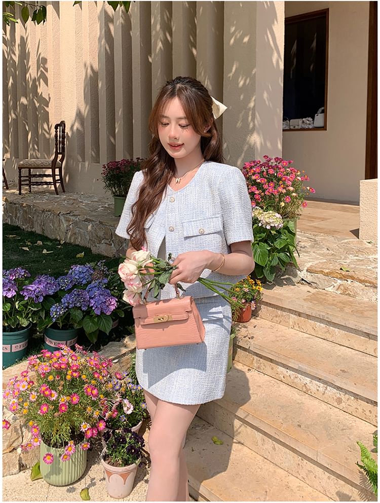 Set: Short-Sleeve Tweed Button-Up Jacket + High Waist Mini A-Line Skirt