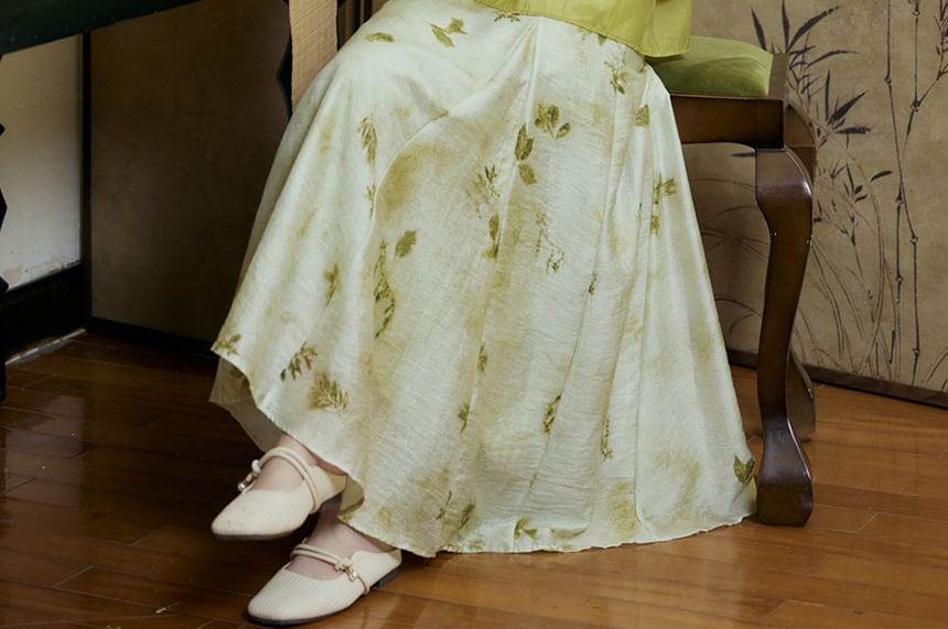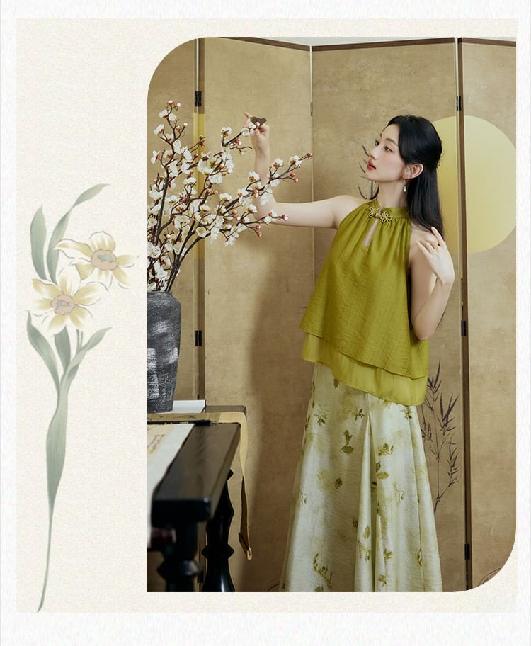 Set: Sleeveless Halter Plain Frog Button Blouse + Print Midi A