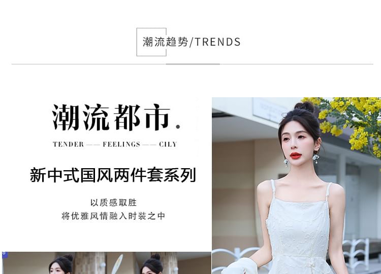 Set: Spaghetti Strap Jacquard Midi A-Line Dress + Short-Sleeve Frog Button Cropped Blouse