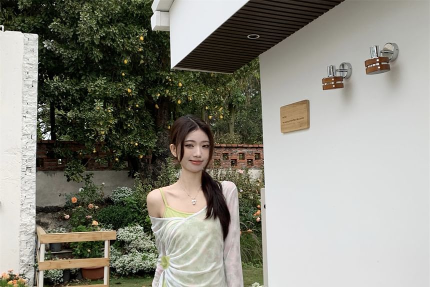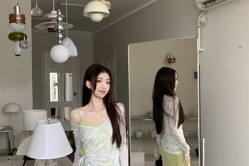 Set: Spaghetti Strap Plain Slit Midi A-Line Dress + Long-Sleeve Cold-Shoulder Top