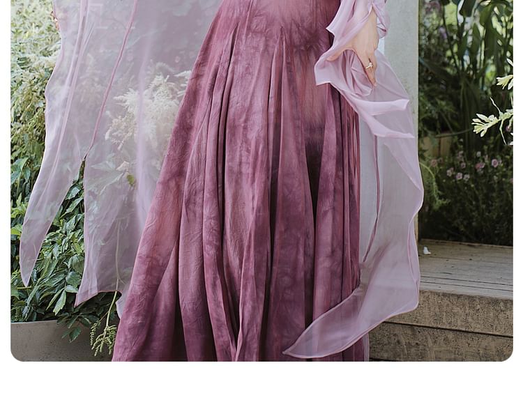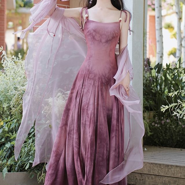 Set: Spaghetti Strap Tie Dye Maxi Sundress + Plain Asymmetrical Light Jacket